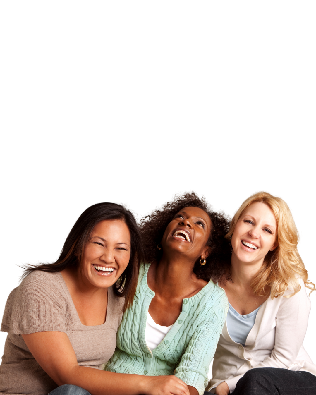 Three women sitting close together, smiling and laughing, appearing happy and joyful.